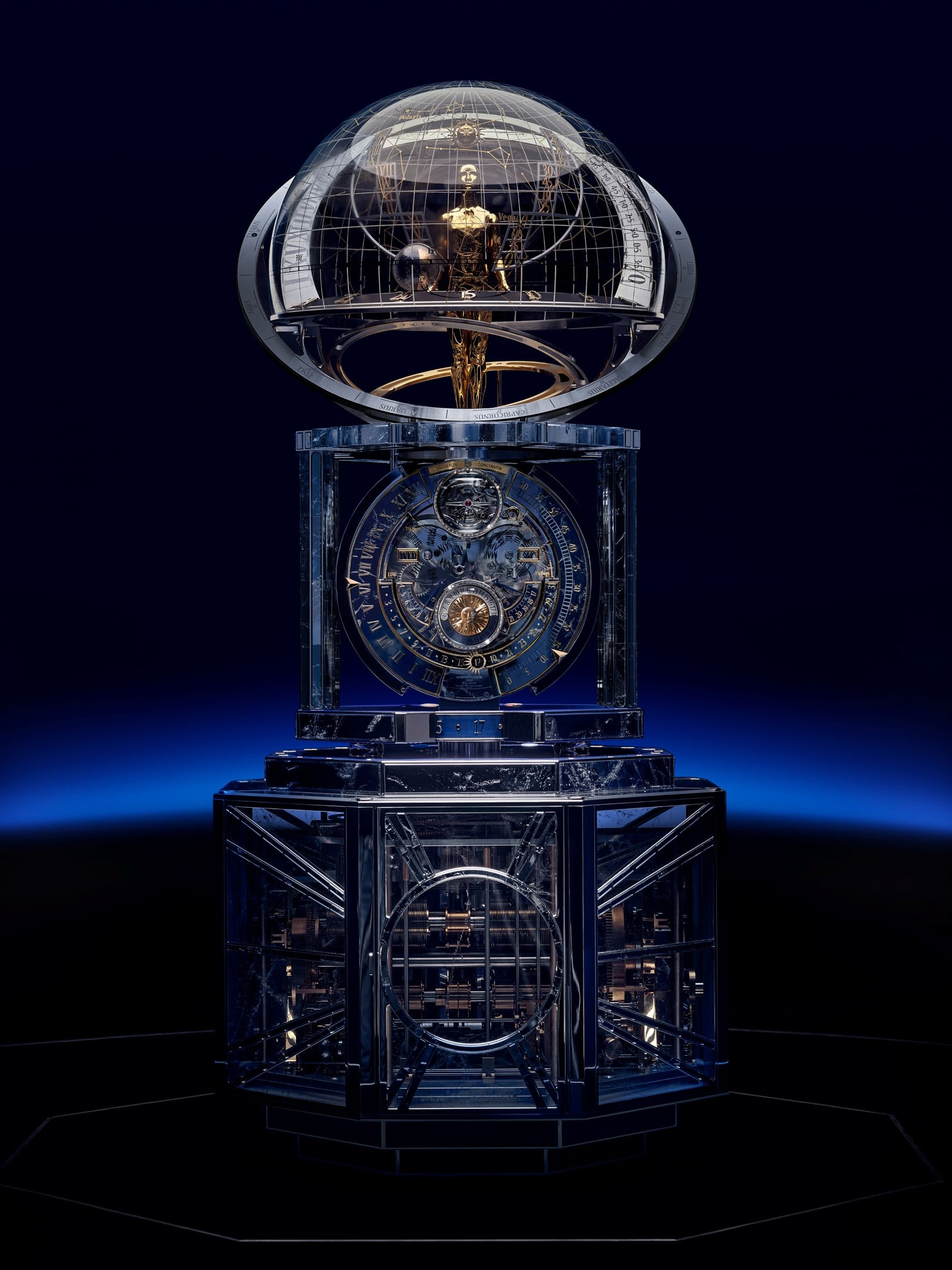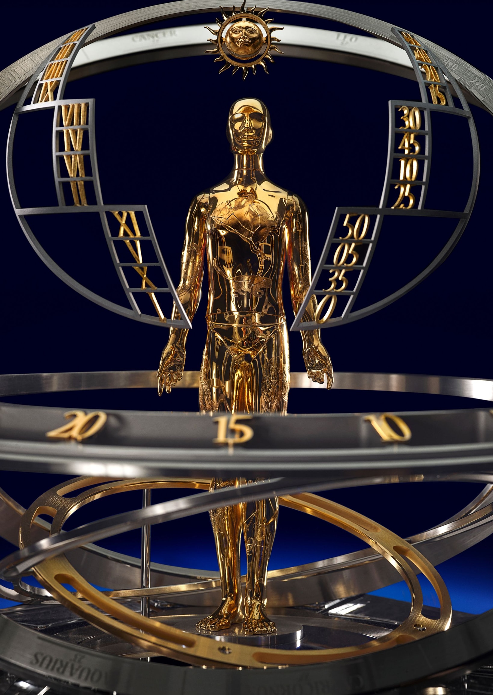 The piece, composed of three parts, is extremely complex. Monumental in both size and appearance, La Quête du Temps stands over a metre tall and is structured in three sections: the dome, the astronomical clock and the base. Beneath the transparent half-sphere decorated with a celestial vault and five constellations, the automaton astronomer indicates the time in 144 different positions, moving his arms, head and torso. Below, the movement of the astronomical clock and the base, home to the mechanism that activates the automaton and generates the music that accompanies its animation, thanks to 158 cams. Fifteen patent applications, including seven watchmakers, accompany the creation.