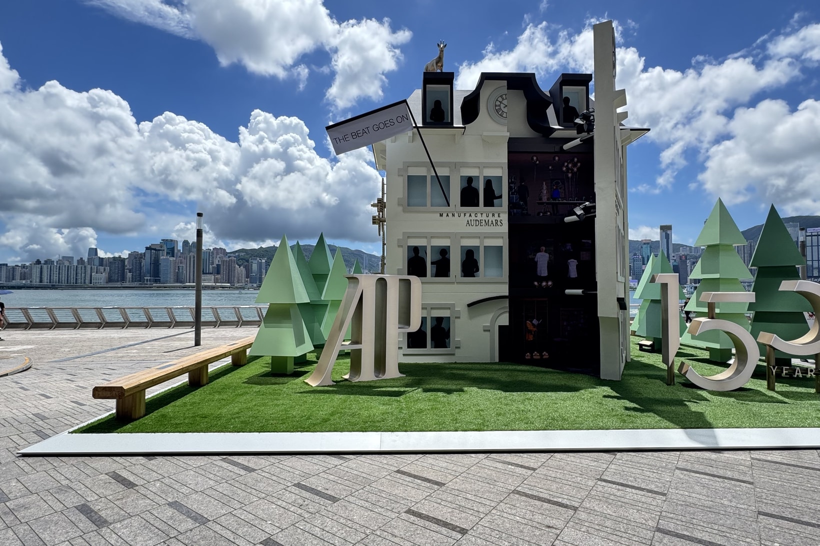 C’est d’ailleurs là, au pied de ce vaisseau amiral du luxe, que la marque du Brassus a choisi de planter le décor de son 150e anniversaire, une représentation miniature du siège de la marque, que les passants peuvent photographier, ou se prendre en photo devant, histoire de célébrer la fusion du savoir-faire combier et la culture hongkongaise. Entre les deux rives, une jonque traditionnelle aux voiles noires flanquées du logo AP navigue doucement depuis quelques jours déjà.